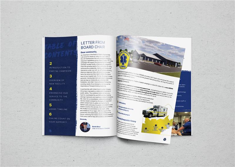 Adams Regional Emergency Medical Services (AREMS) is a nonprofit organization providing 24/7 emergency medical services to communities across Adams County, Pennsylvania. As the organization prepared to support a capital campaign, it needed a comprehensive case for support to clearly communicate its mission, impact, and priorities to prospective donors. The existing materials lacked a cohesive structure and a clear narrative connecting day-to-day operations to the organization’s long-term goals. Without a unified presentation, it was difficult to effectively organize complex information and present it in a way that was easy for donors to navigate and understand.